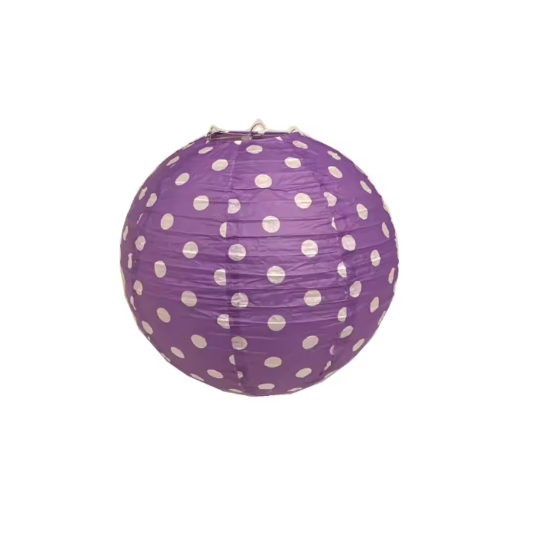 Elevate your event décor with this expertly crafted purple paper lantern adorned with crisp white dots. Its lightweight design allows for easy hanging, creating a charming ambiance with soft, diffused light. Ideal for both indoor and outdoor settings, this lantern adds a sophisticated yet playful touch to celebrations, enhancing the atmosphere with subtle elegance.