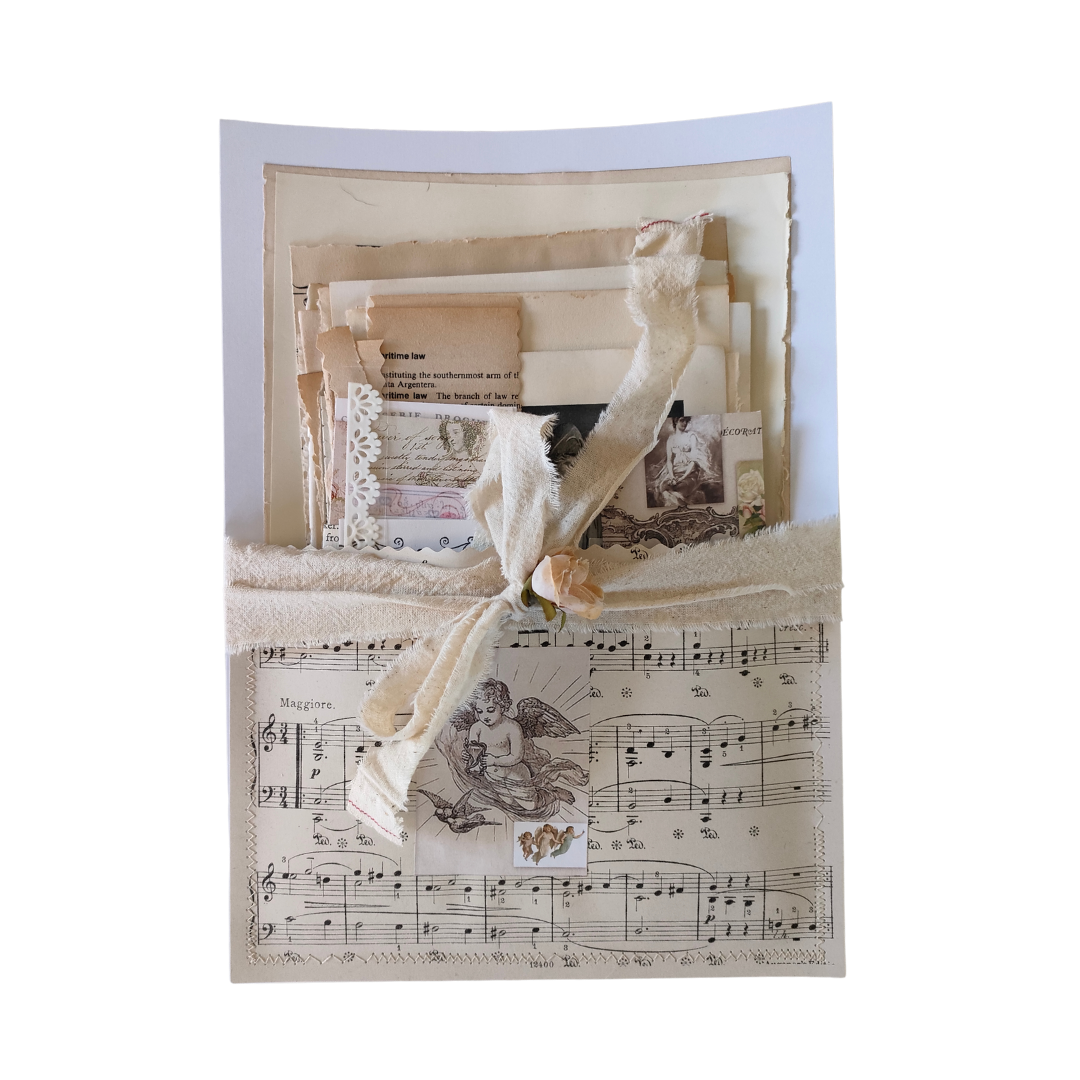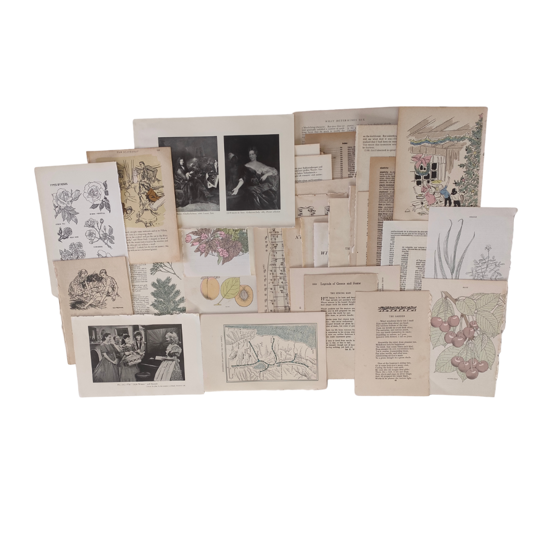 Get inspired with this eclectic Bundle of 35 naturally aged, authentic, Vintage Book Pages, Illustrations and Pictures from REAL Books. Some French and German Pages are included as well as beautifully aged blank pages and Poems. Due to their age they may have tears, creases and folds. Thoughtfully curated for enthusiasts seeking to elevate their creative projects. No two sets are exactly alike. The Bundle also includes 12 printed Cards to create your own Gift Tags, a small printed Vintage Paper Envelope contains a variety of embellishments and handmade Stamps, to assist with your creation. A small Card of Lace and one small Card of Frayed ribbon together with a few printed goodies is also included. The printed Envelope and handmade Vintage Page Pouch can also be used in your Project. Perfect for adding depth and character to your creativity, it offers versatile materials that inspire artistic expression and detailed storytelling. Ideal for both beginners and seasoned crafters.