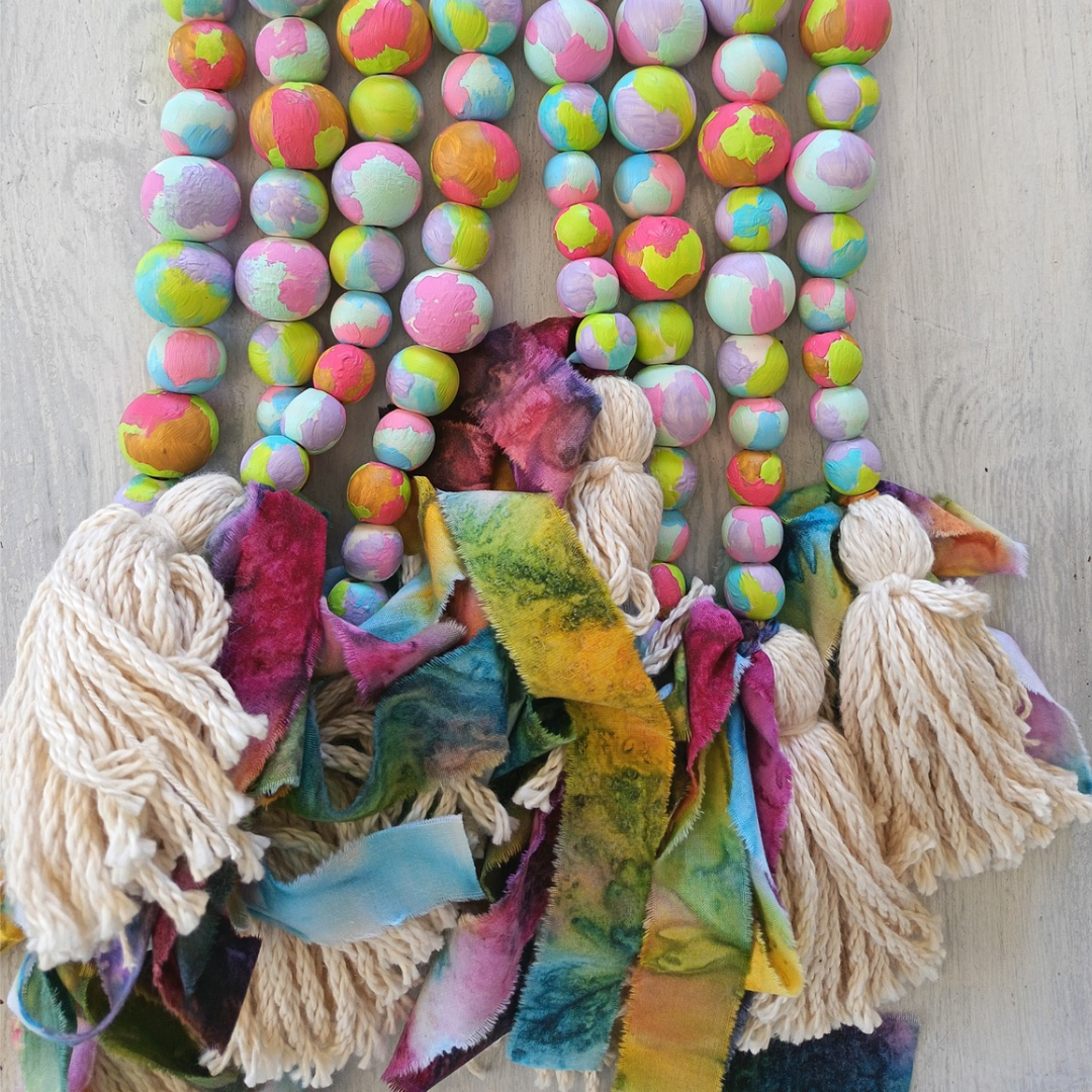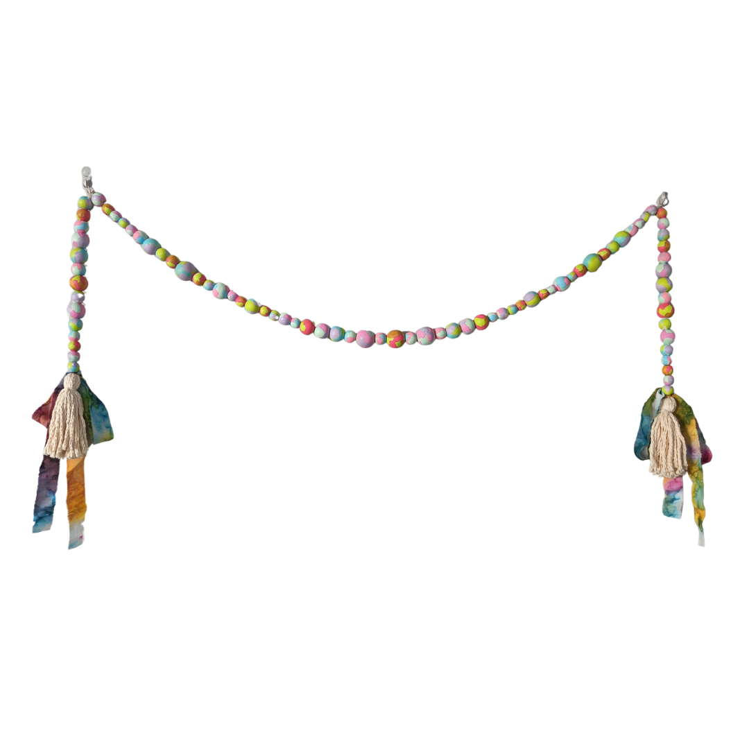 This handpainted wooden bead garland with raw cotton tassels and hand dyed fabric ribbon is a unique and beautiful addition to any room or event. Each bead is carefully painted, creating a one-of-a-kind piece. With its fun colours and rustic feel, it adds a touch of warmth and charm to any space. Perfect for adding a pop of colour and texture to your decor.